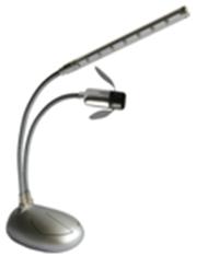 USB Desk Light with Fan 7 wide-angle high brightness white LED PVC soft fan blades for safety, metal flexible neck Two switch control Works on any computer with a USB port Working voltage: DC 5V, Working current: 350mA"