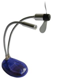 USB Desk Light with Fan one high brightness white LED PVC soft fan blades for safety, metal flexible neck Two switch control Works on any computer with a USB port Working voltage: DC 5V, Working current: 220mA"